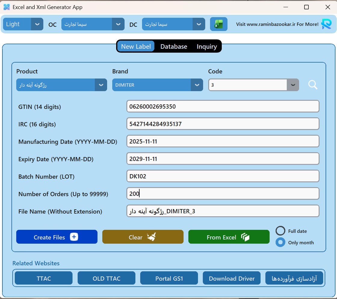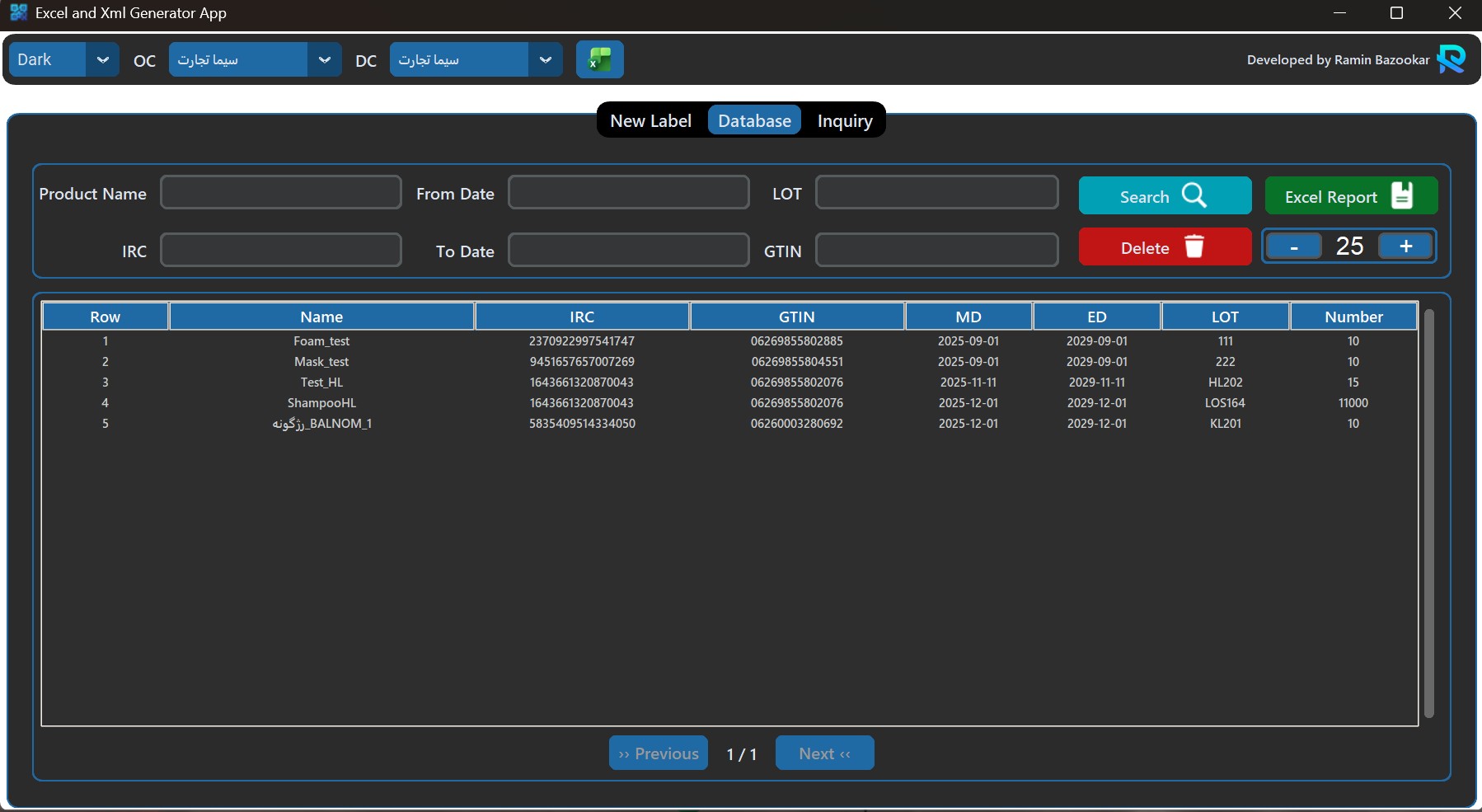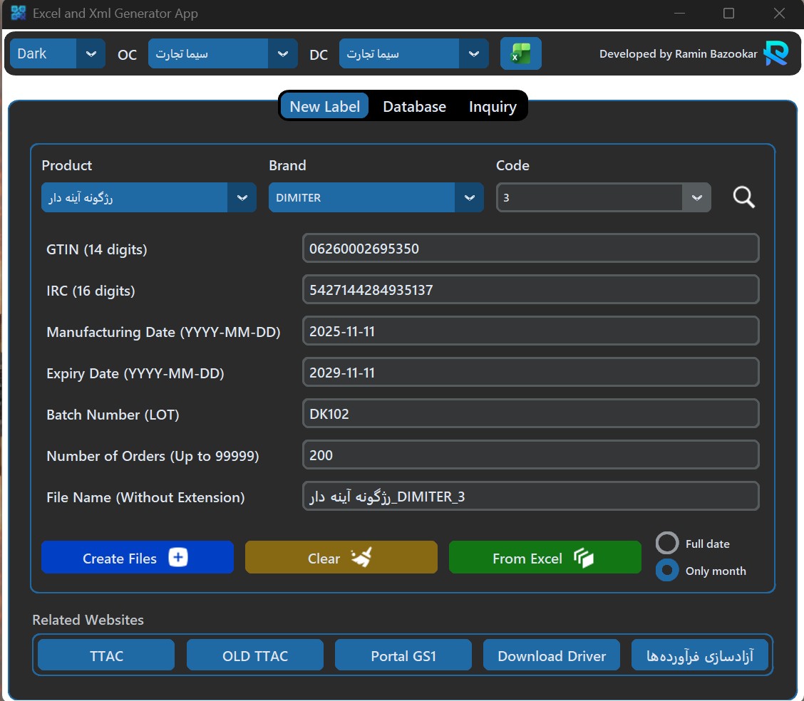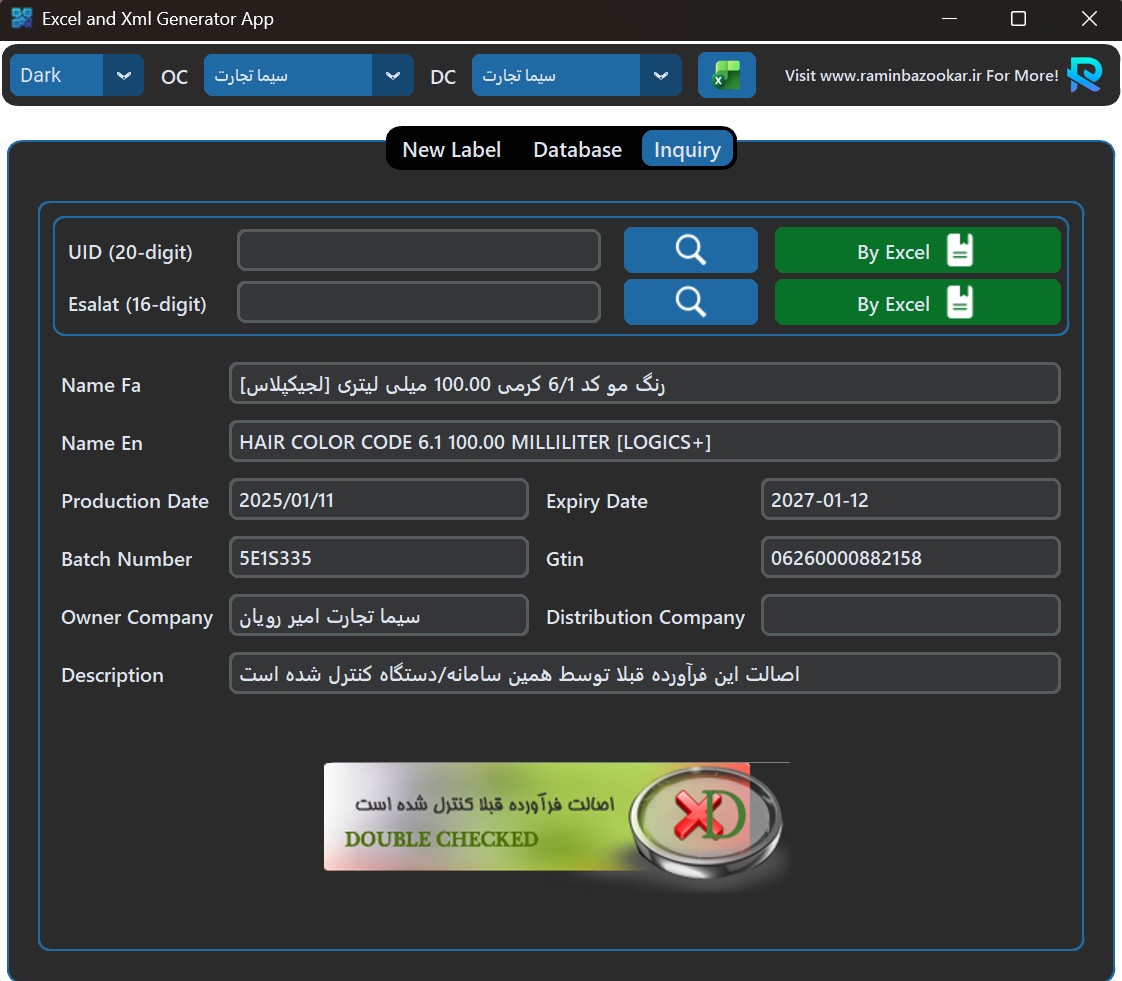 • فایل اکسل شامل کدهای DataMatrix، UID، GTIN، کد اصالت ۱۶ رقمی، تاریخ انقضا، تاریخ تولید، لات نامبر (Batch Number)، نام محصول و IRC میباشد.