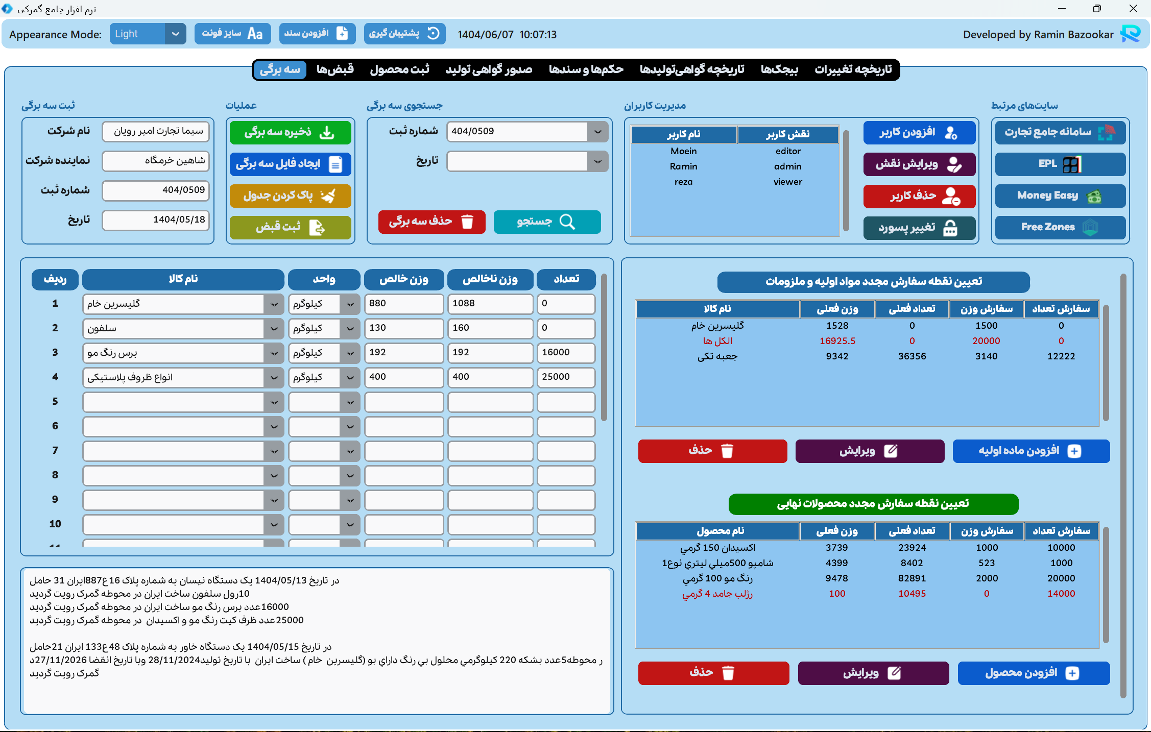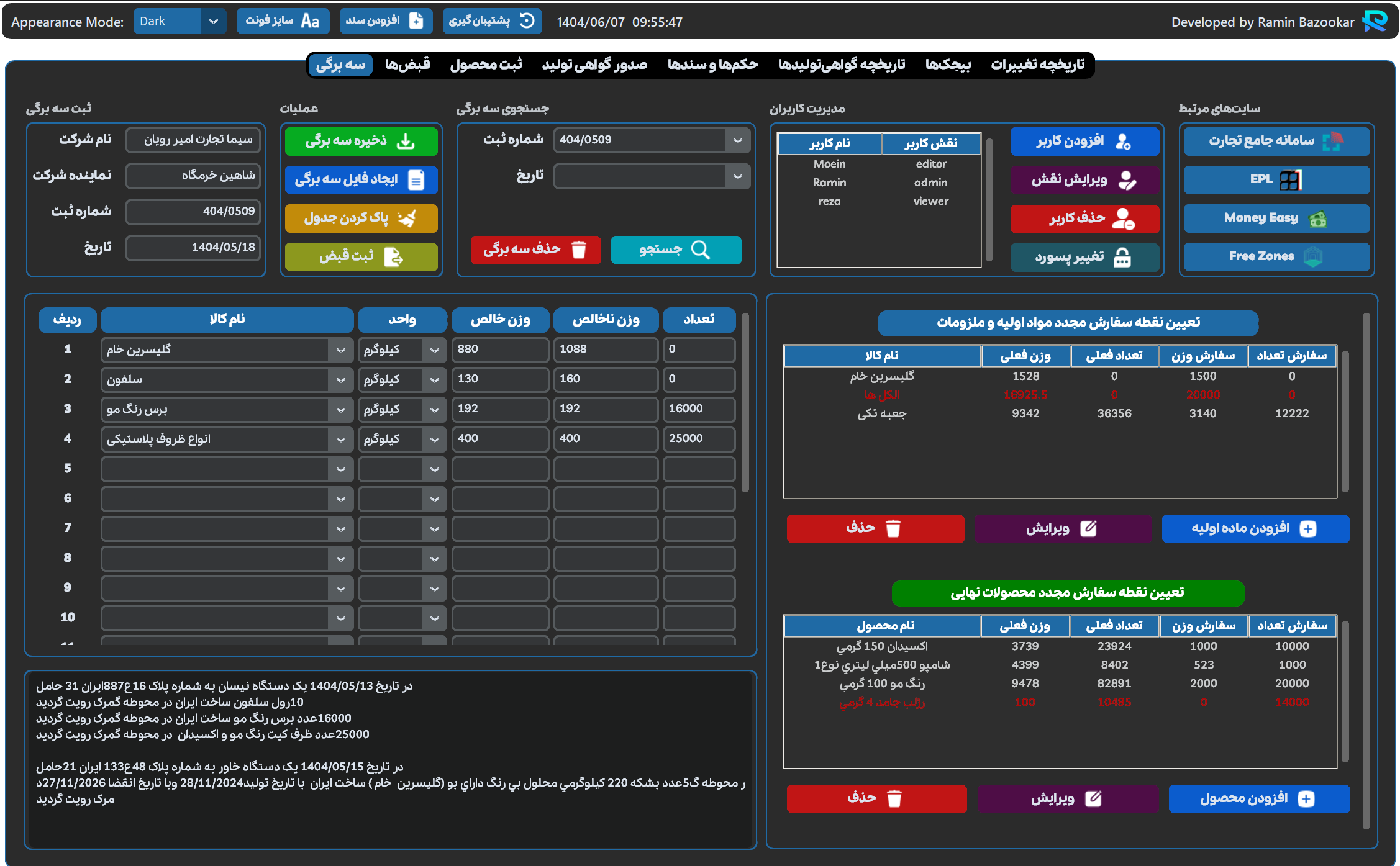 نرم افزار گمرک من، یک راهکار یکپارچه و پیشرفته است که بهطور ویژه برای شرکتهای مستقر در مناطق ویژه اقتصادی طراحی و توسعه یافته است. این سیستم با ارائه پنلهای اختصاصی، امکان مدیریت دقیق و بهینه تمامی فرآیندهای مرتبط با اسناد گمرکی را فراهم میکند و به کاربران کمک میکند تا عملیات روزانه خود را به سرعت و با دقت بالا انجام دهند.