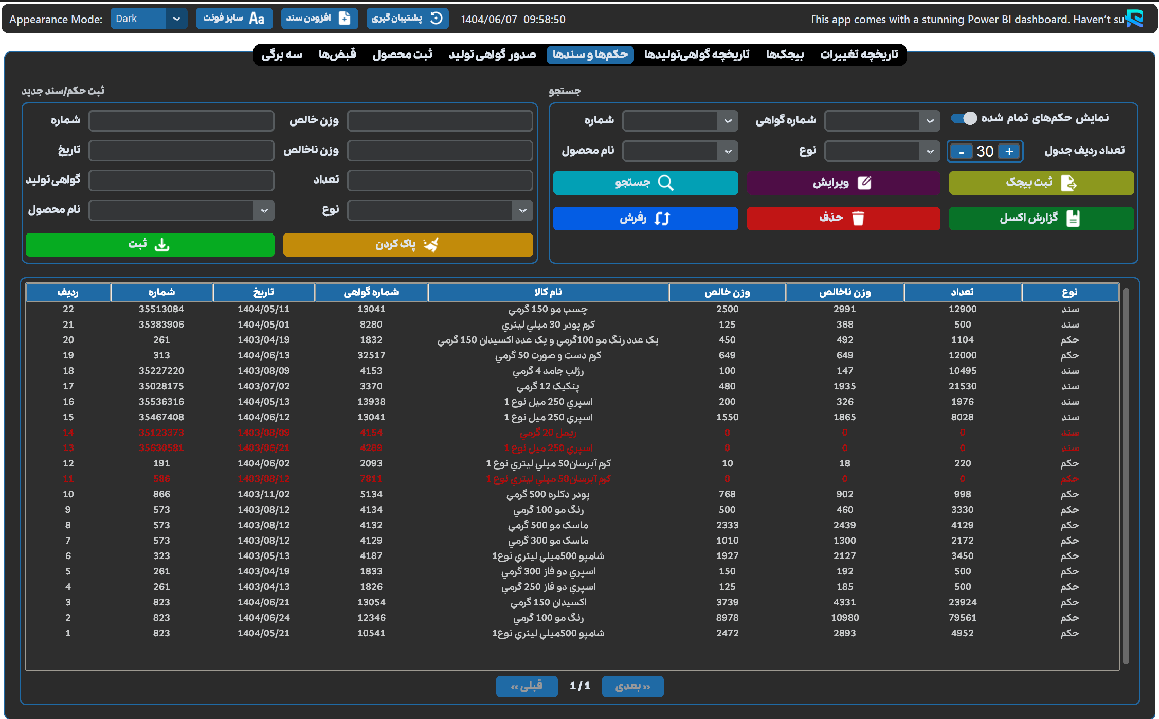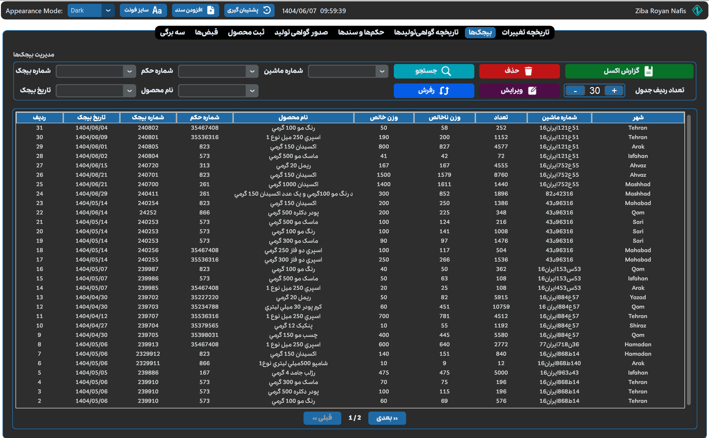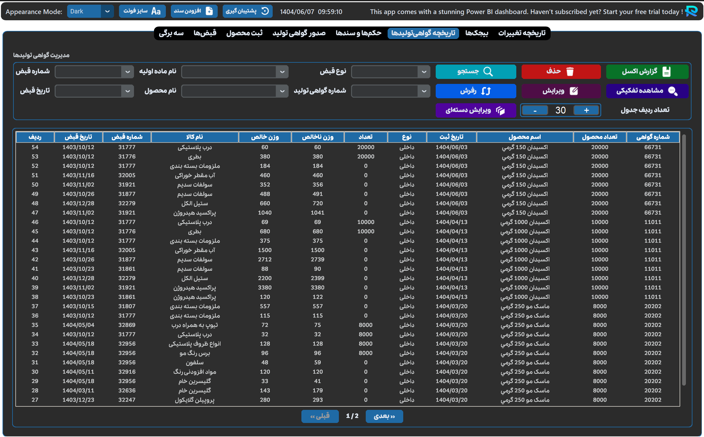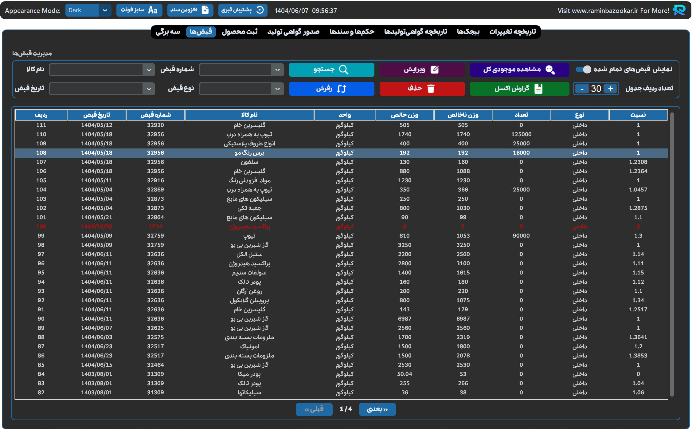 - مدیریت جامع قبضها با امکان جستجو بر اساس شماره قبض، نام کالا، تاریخ قبض و نوع قبض