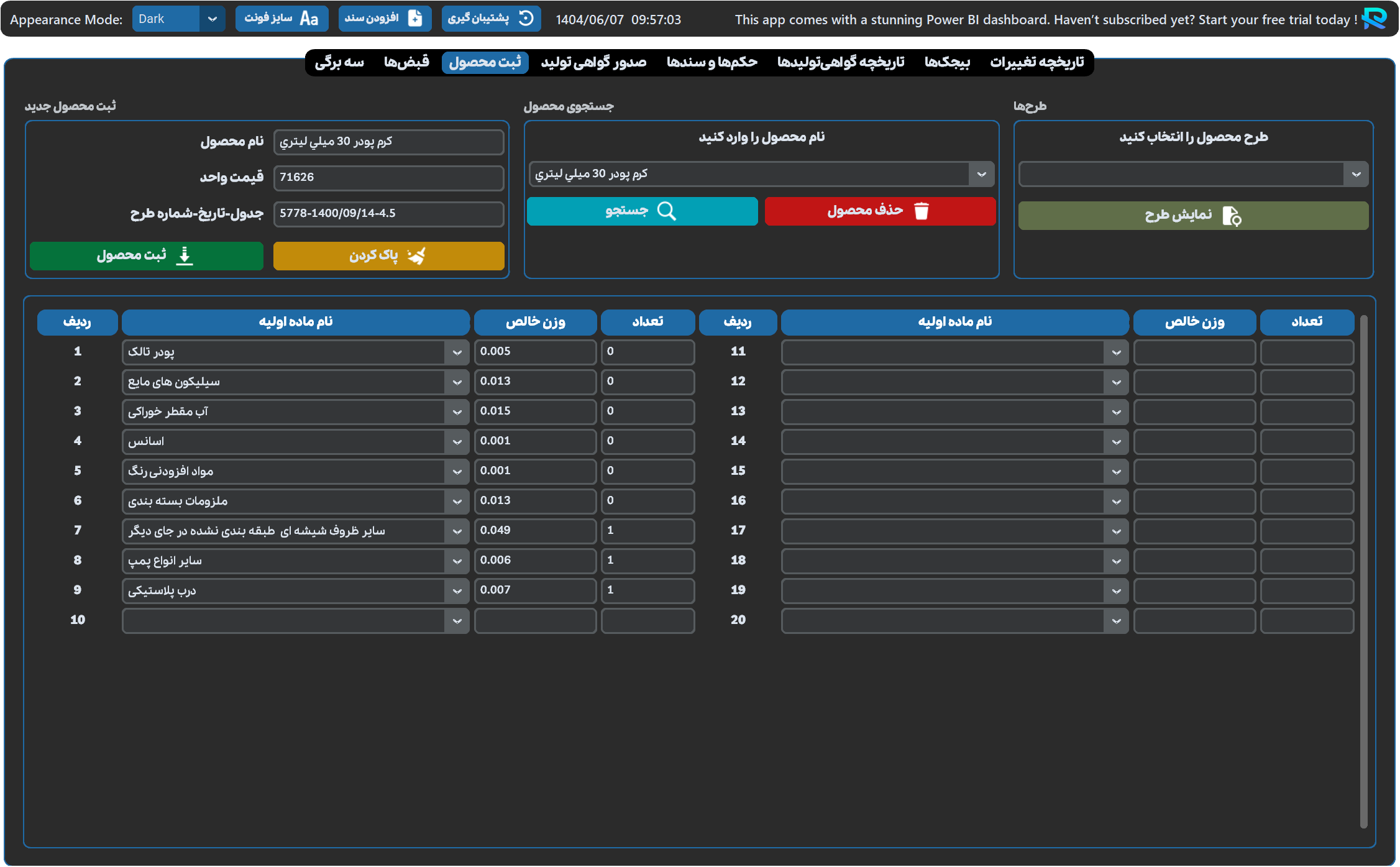 تب ثبت محصول: