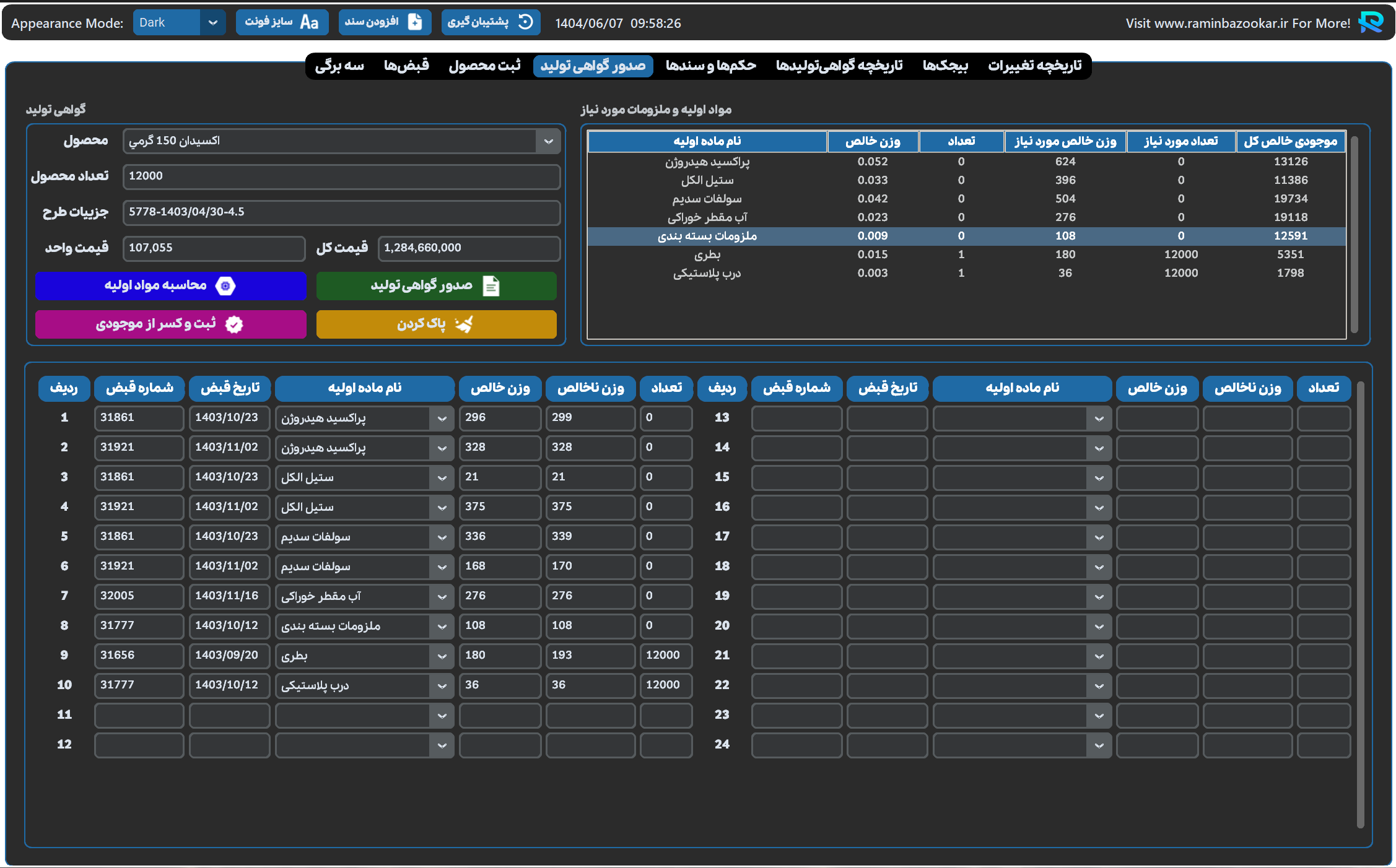 - نمایش کمبود موجودی مواد اولیه و ملزومات هنگام صدور گواهی تولید